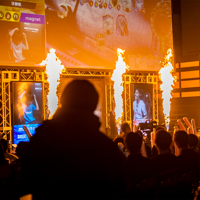 『Shadowverse』の競技としての醍醐味は、お互いがつねに何手も先の行動や流れを予測してプレイしていく、eスポーツタイトル屈指の頭脳戦が繰り広げられること。選手はそれぞれ青/赤のブースに入って1対1でプレイを行い、相手の手を読んだ有効打を繰り出したり、一気に攻勢をかけたりするたびに、観客のボルテージが上がっていく。たった一手で試合の優勢/劣勢が大きく変わる予測不能の試合展開も大きな魅力になっている。